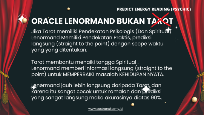 Lenormand bukan Tarot. Tarot memliki pendekatan psikologis spiritual maka Lenormand lebih pada pendekatan praktis langsung apa adanya. Lenormand bicara kejujuran apa adanya baik dikatakan baik, jika buruk maka dikatakan buruk. Lenormand lebih ke straight to the point.